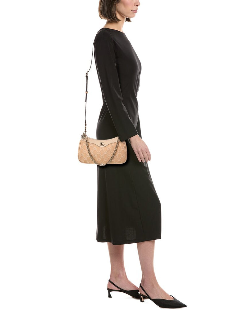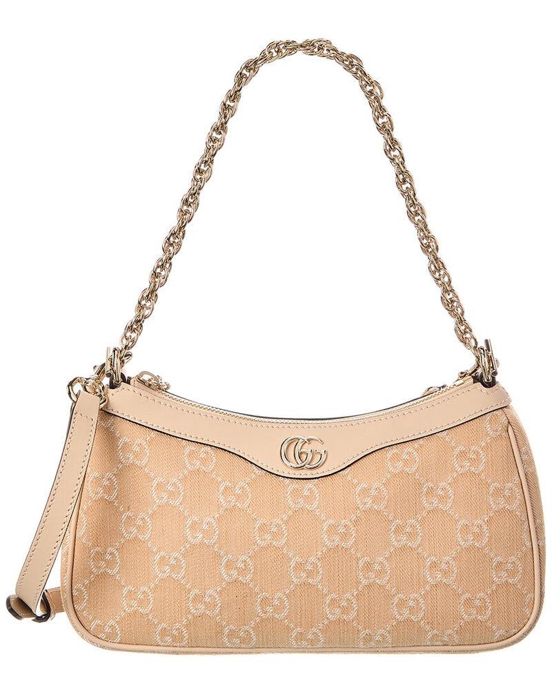 • OPHIDIA SMALL GG DENIM & LEATHER SHOULDER BAG IN BEIGE GG DENIM AND LEATHER WITH LIGHT FINE GOLD HARDWARE AND INTERLOCKING G LOGO ACCENT