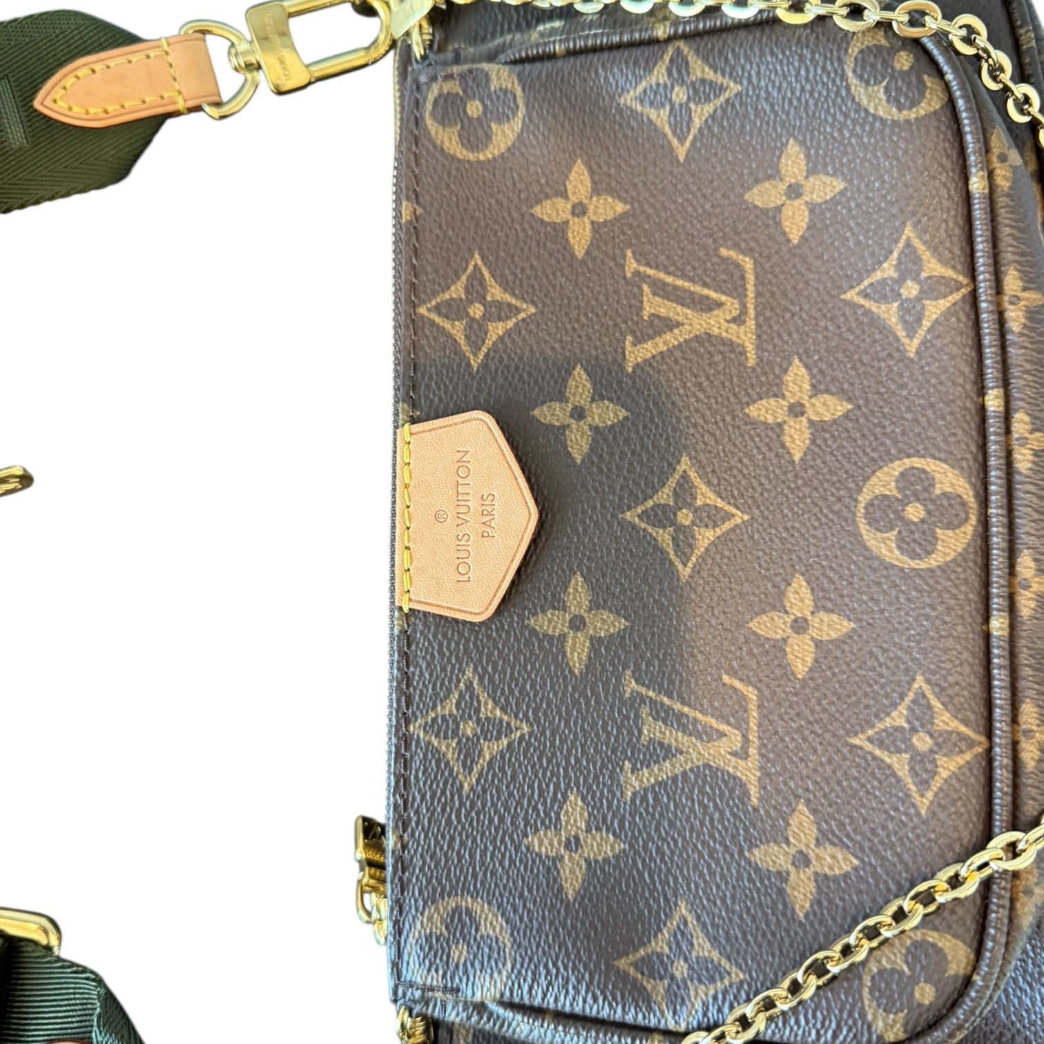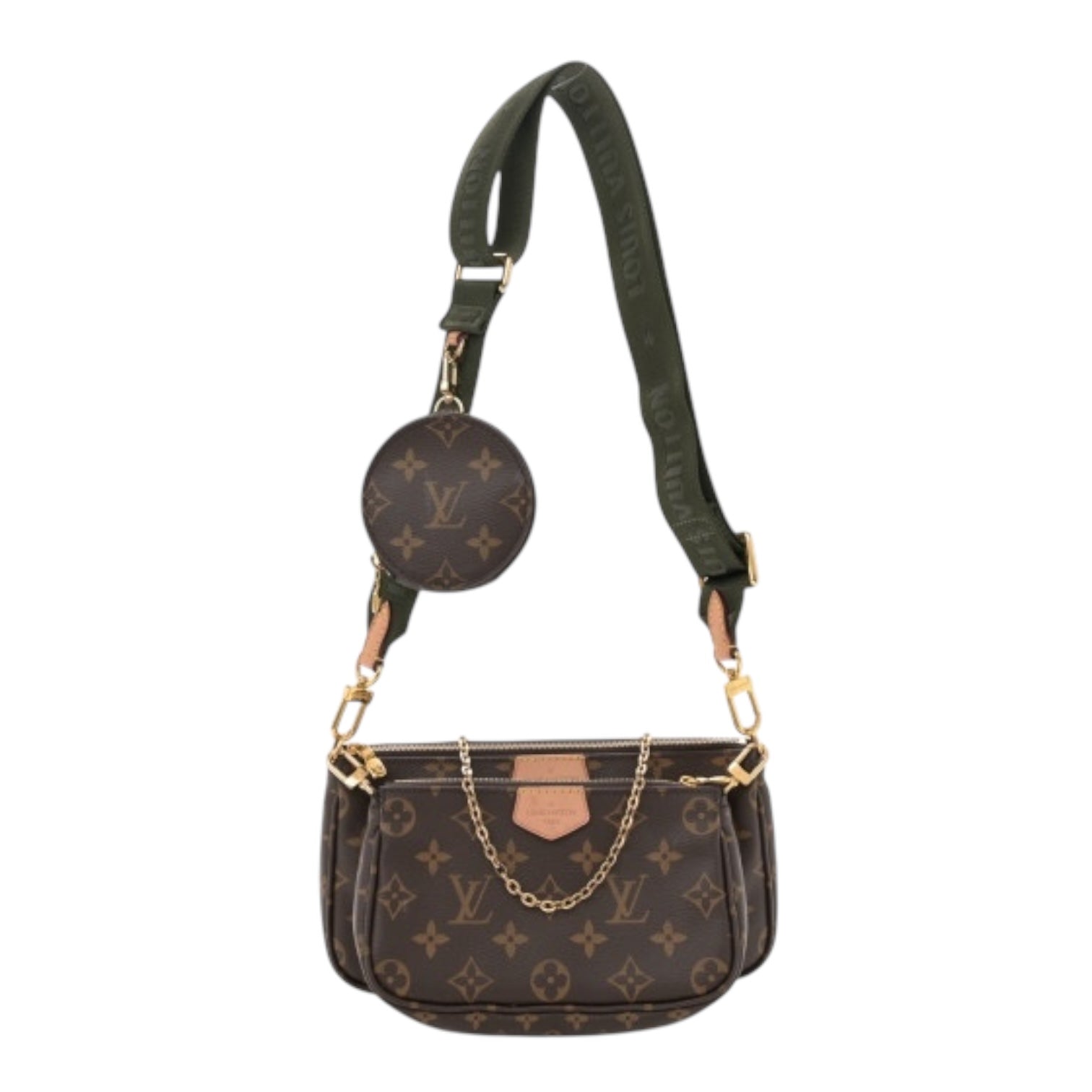 This hybrid crossbody bag is crafted of classic and mini monogram canvas in brown. It features a pochette accessories, a small pochette accessories, and a round coin purse. It has both a removable brass chain and an adjustable hunter-green Louis Vuitton inscribed Jacquard strap for multiple carrying options. This style can be worn 6+ ways. Shows signs of honey patina and small marker mark on part of the jacquard green strap (photographed). Interior and canvas is clean.