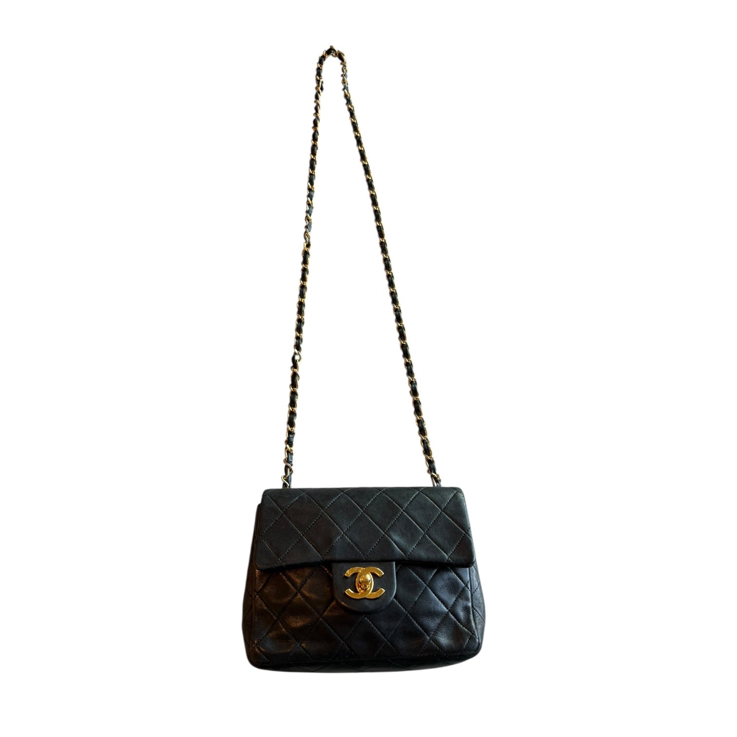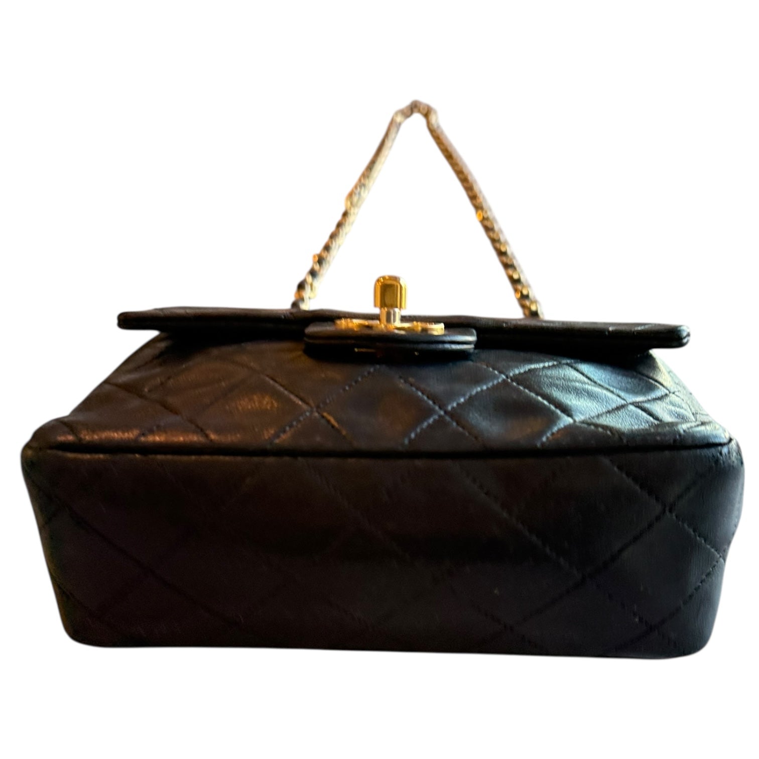 This black lambskin vintage flat bag has gold plated hardware with slight discoloration on the turn lock. This feature is a 22 inch drop Crossbody strap that cannot be converted to a shoulder bag. The shows overall vintage signs of use to the structure and leather as well as that maroon leather interior. Includes care slot and zip pocket on the interior. Includes Entrupy certificate only.