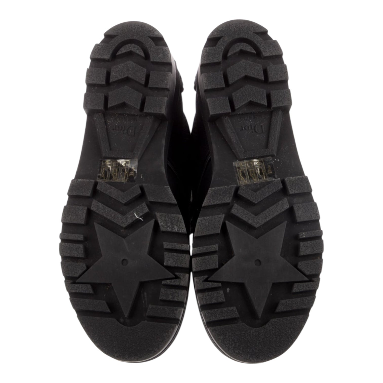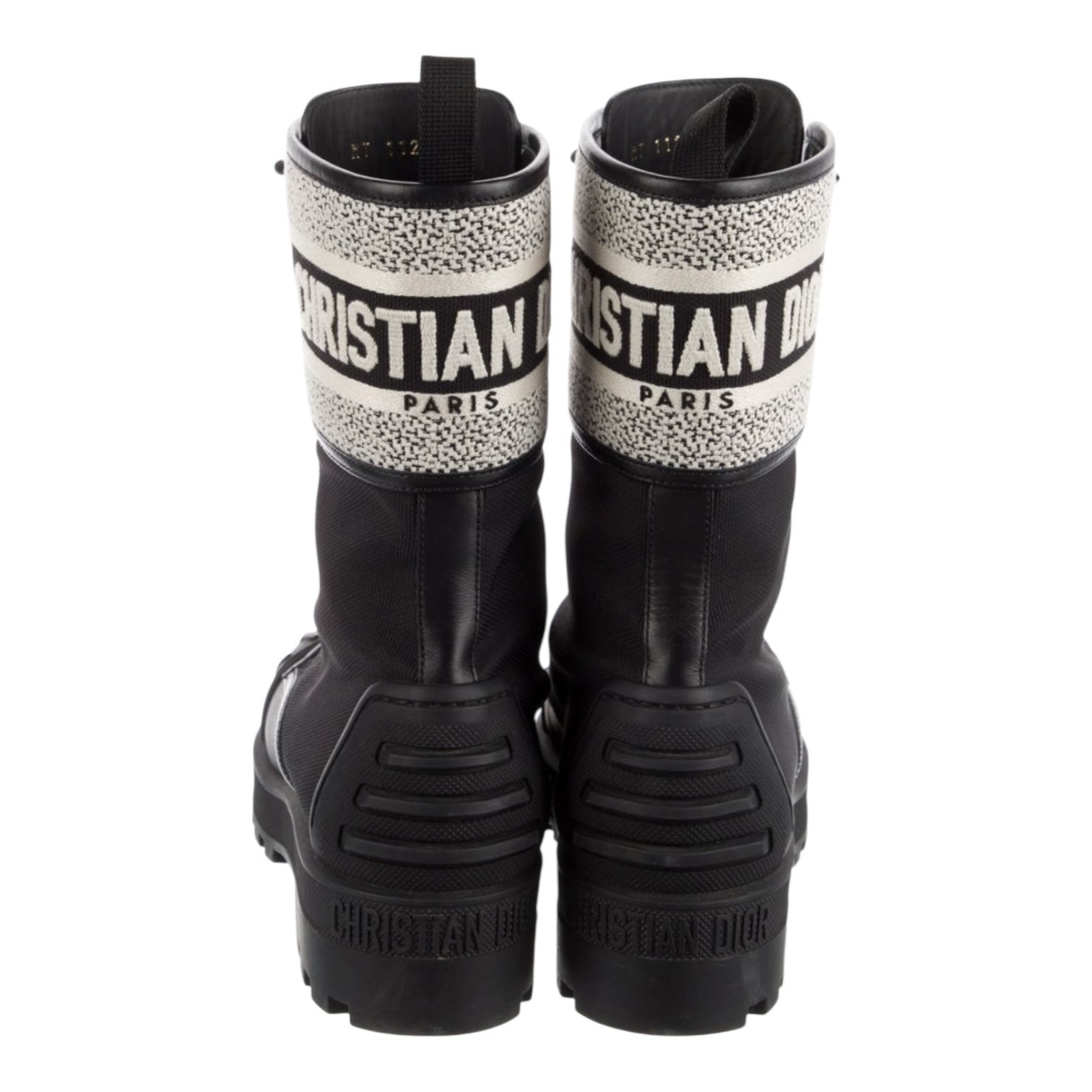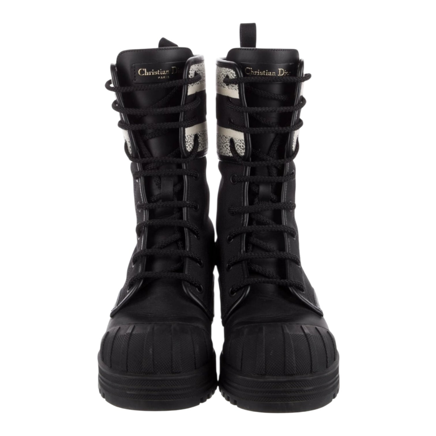 The D-Major ankle boot is offered in a military-inspired variation. The black technical fabric and calfskin laced style is embellished with a white Christian Dior embroidered band, inspired by the Dior Book Tote. The rubber heel counter, round toe and thick notched sole complete the design.
