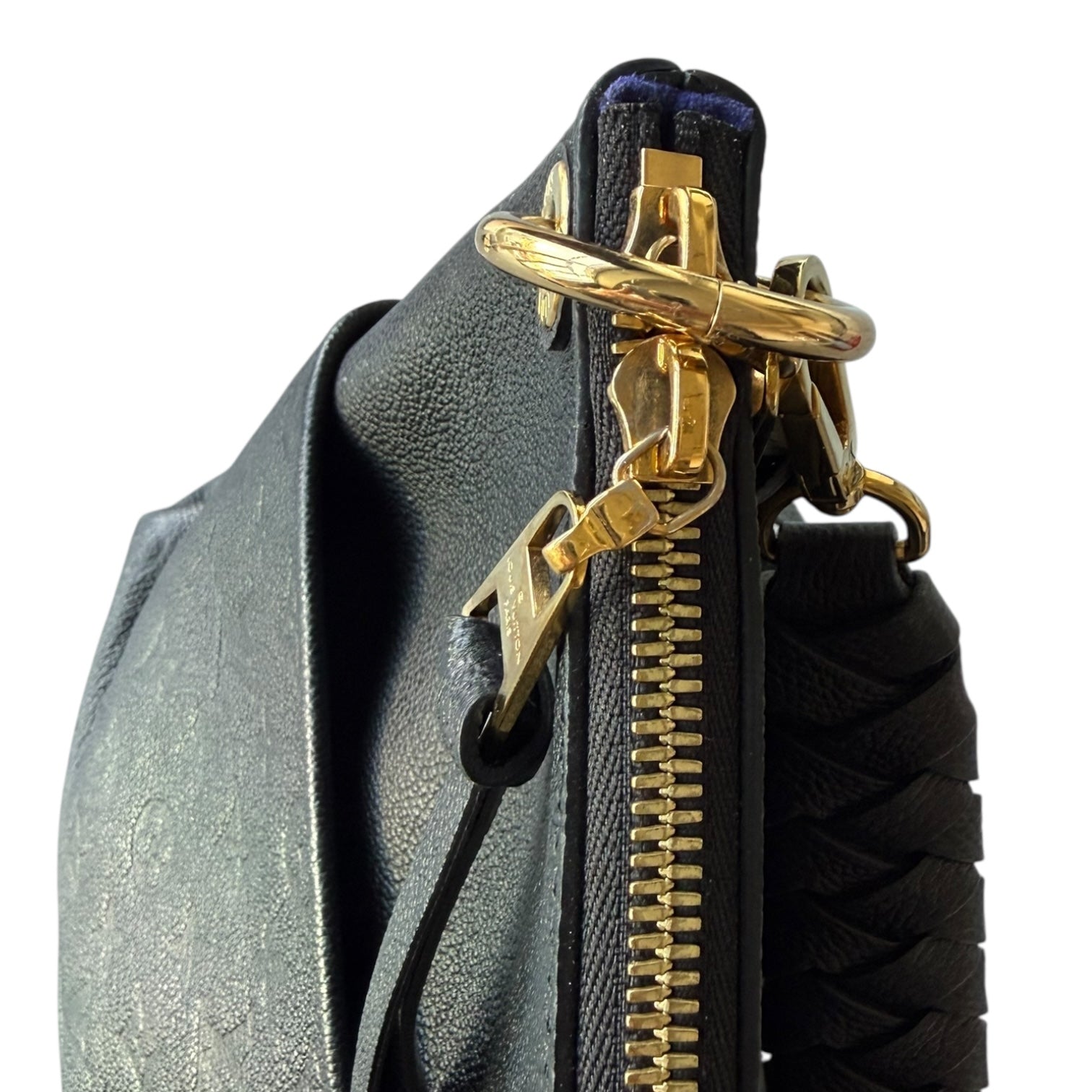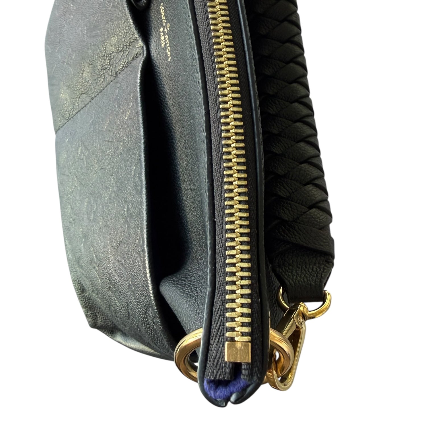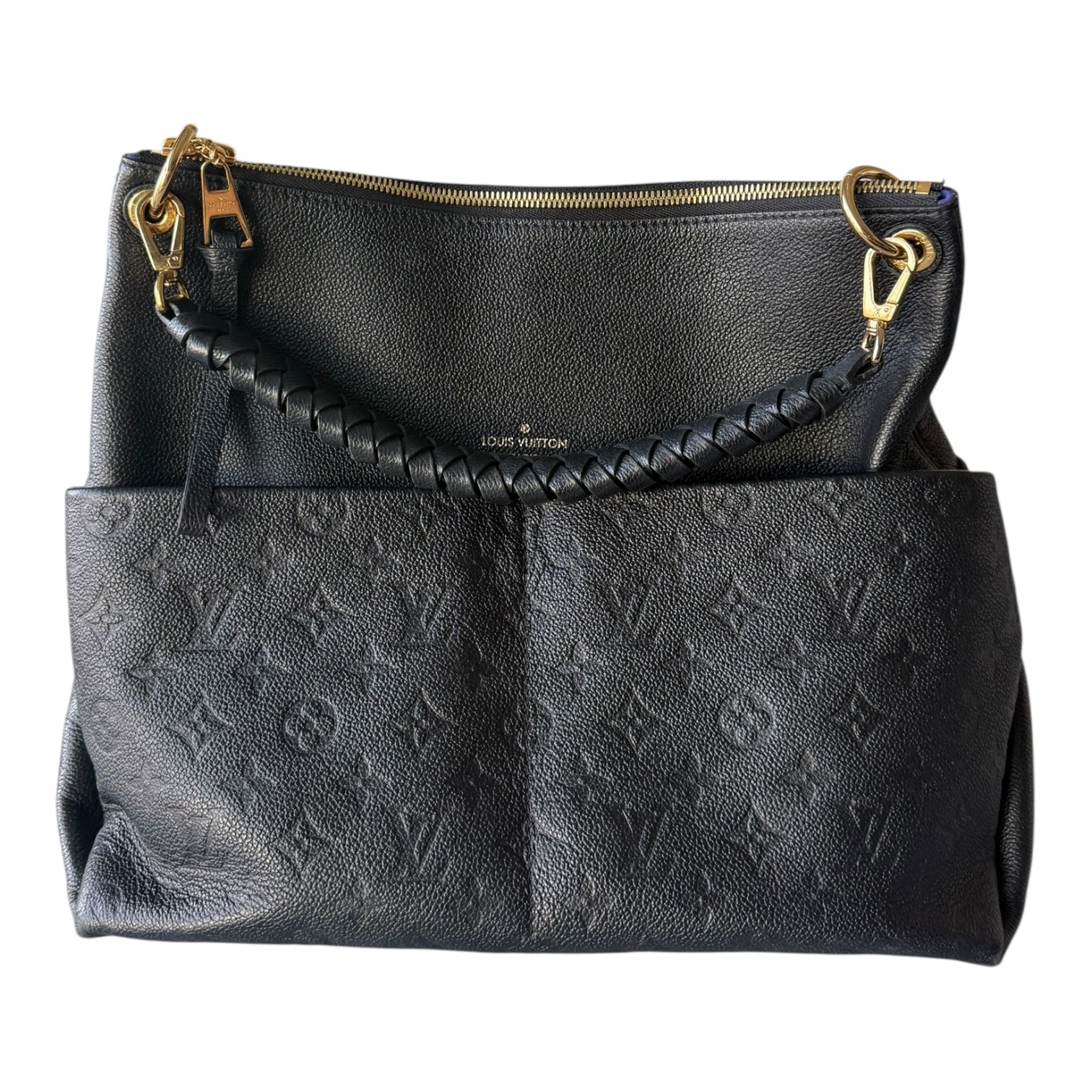 This hobo is crafted of Louis Vuitton monogram embossed calfskin leather in black. The bag features exterior front pockets, a braided leather shoulder strap, and polished brass hardware. The top zipper opens to a blue microfiber interior with patch pockets. This shows light corner rubbing as well as some seam interior signs of use. No major signs of use or wear. Dust bag, Entrupy and box included. This style is great for travel and everyday with the optional crossbody and zip top.