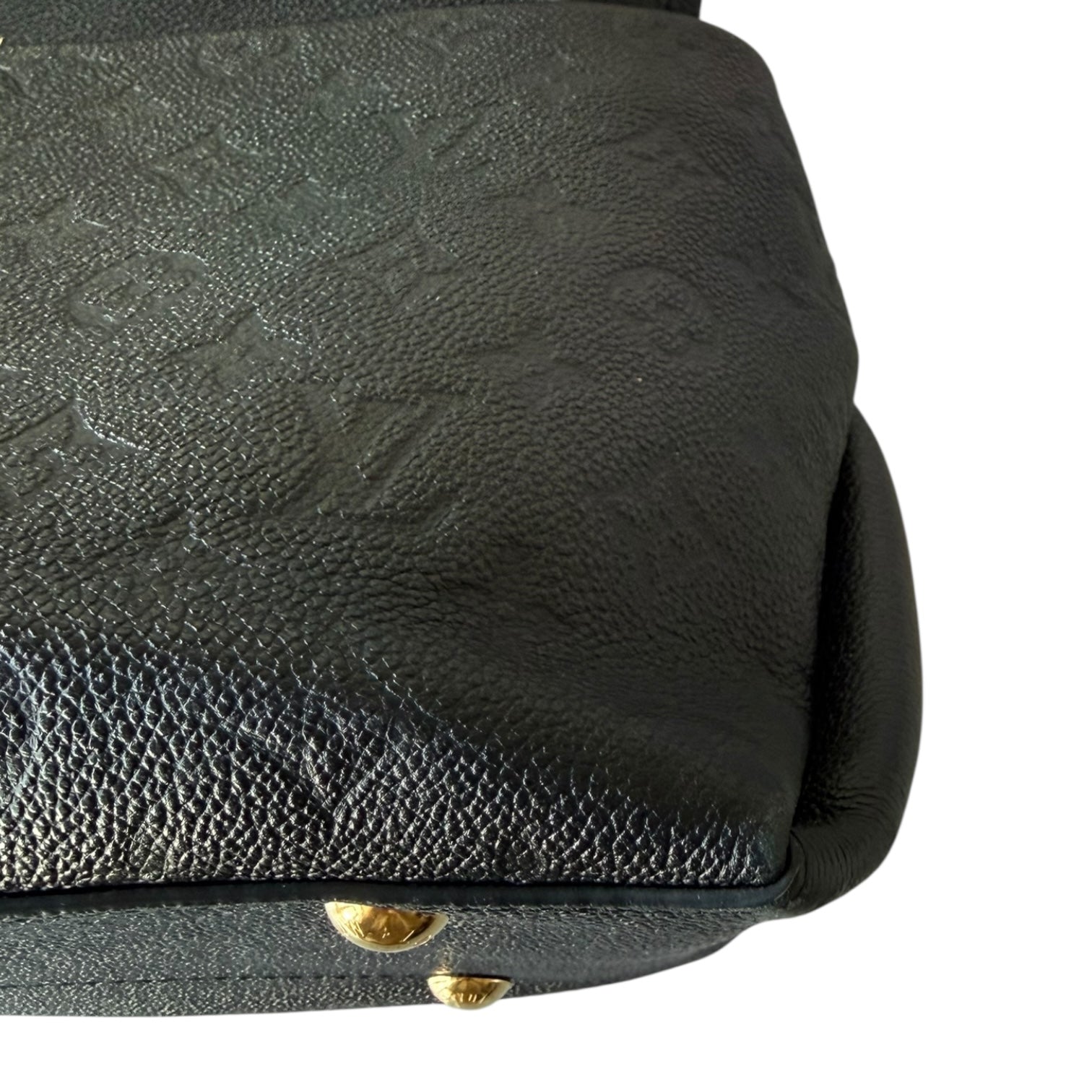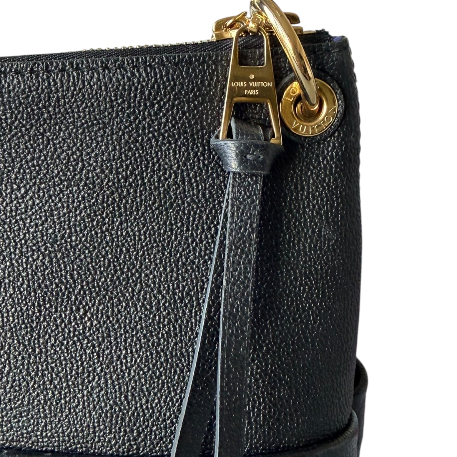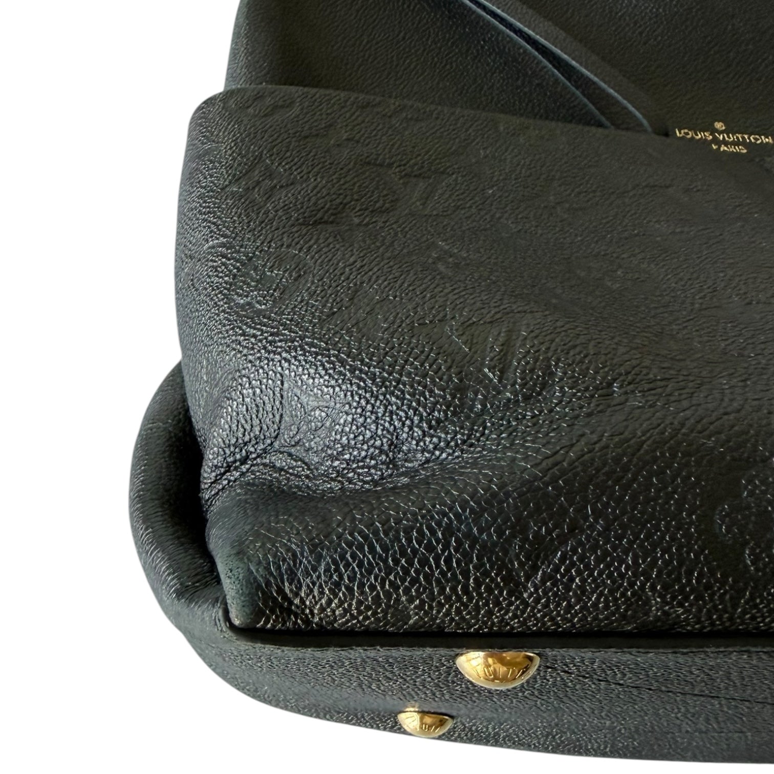 This hobo is crafted of Louis Vuitton monogram embossed calfskin leather in black. The bag features exterior front pockets, a braided leather shoulder strap, and polished brass hardware. The top zipper opens to a blue microfiber interior with patch pockets. This shows light corner rubbing as well as some seam interior signs of use. No major signs of use or wear. Dust bag, Entrupy and box included. This style is great for travel and everyday with the optional crossbody and zip top.