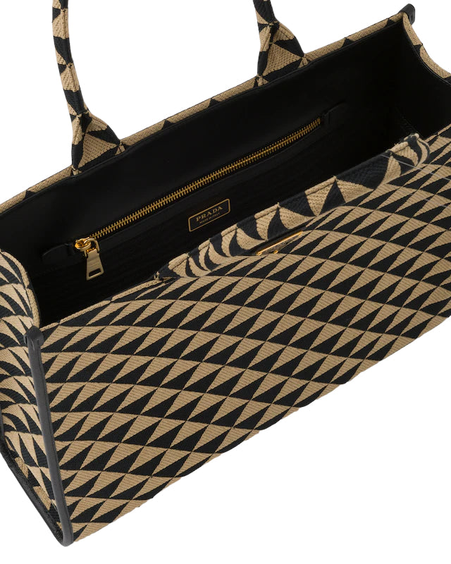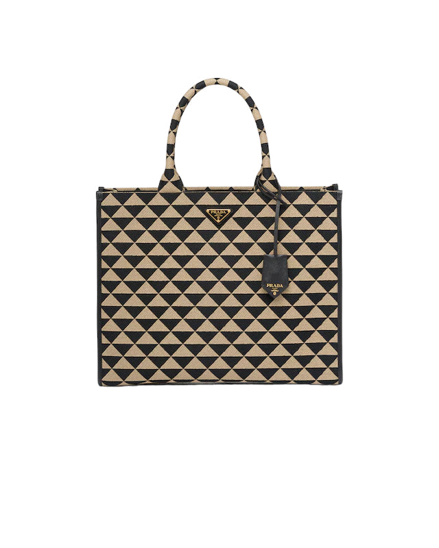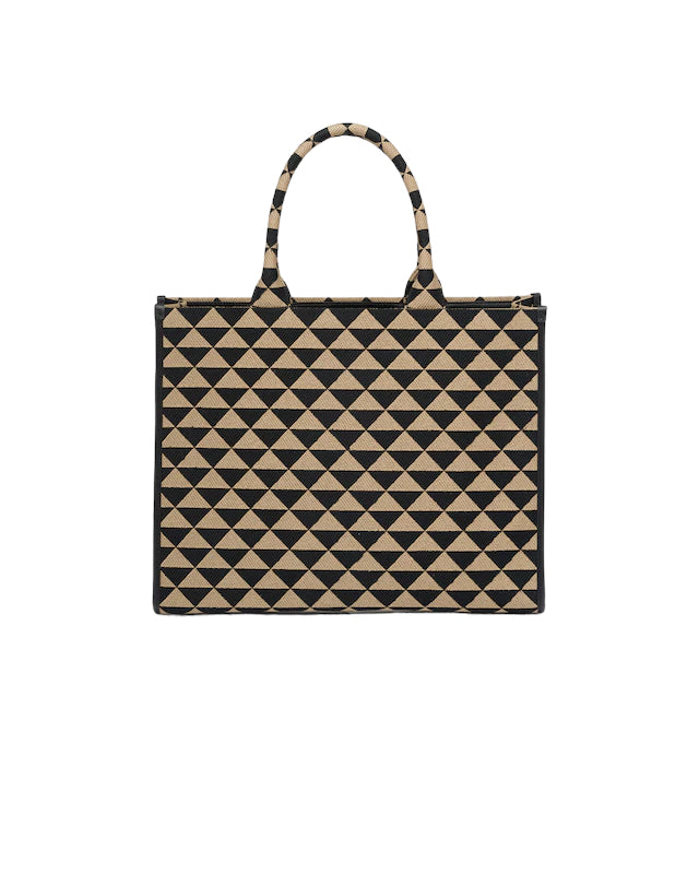 Introduced for the first time on trunks designed by Mario Prada, the Prada triangle expresses uniqueness and modernity through its universal, minimalist shape that is reinvented in a different way each season. Here, the geometric design is transformed into a sophisticated yet modernist pattern that plays with contrasting colors and decorates this sleek tote bag. Details in the brand's iconic Saffiano leather embellish the design.